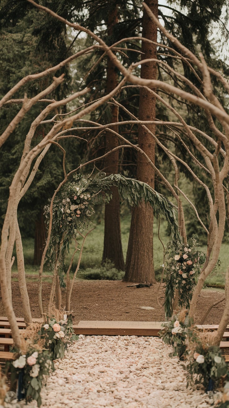 Tree branch archways create a stunning focal point, beautifully merging rustic decor with nature’s elegance.