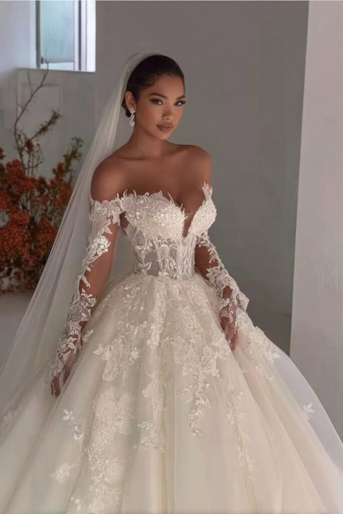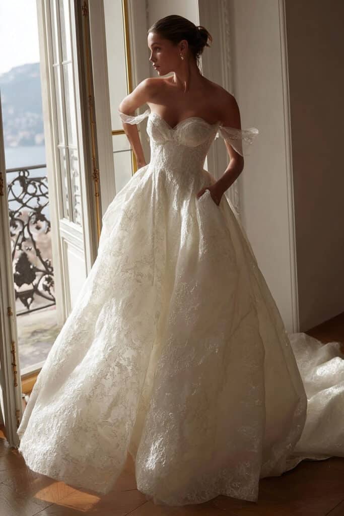 Step into a fairytale with a Cinderella-inspired off-the-shoulder wedding dress. This look blends a fitted bodice with an elegant neckline that lets your shoulders shine.