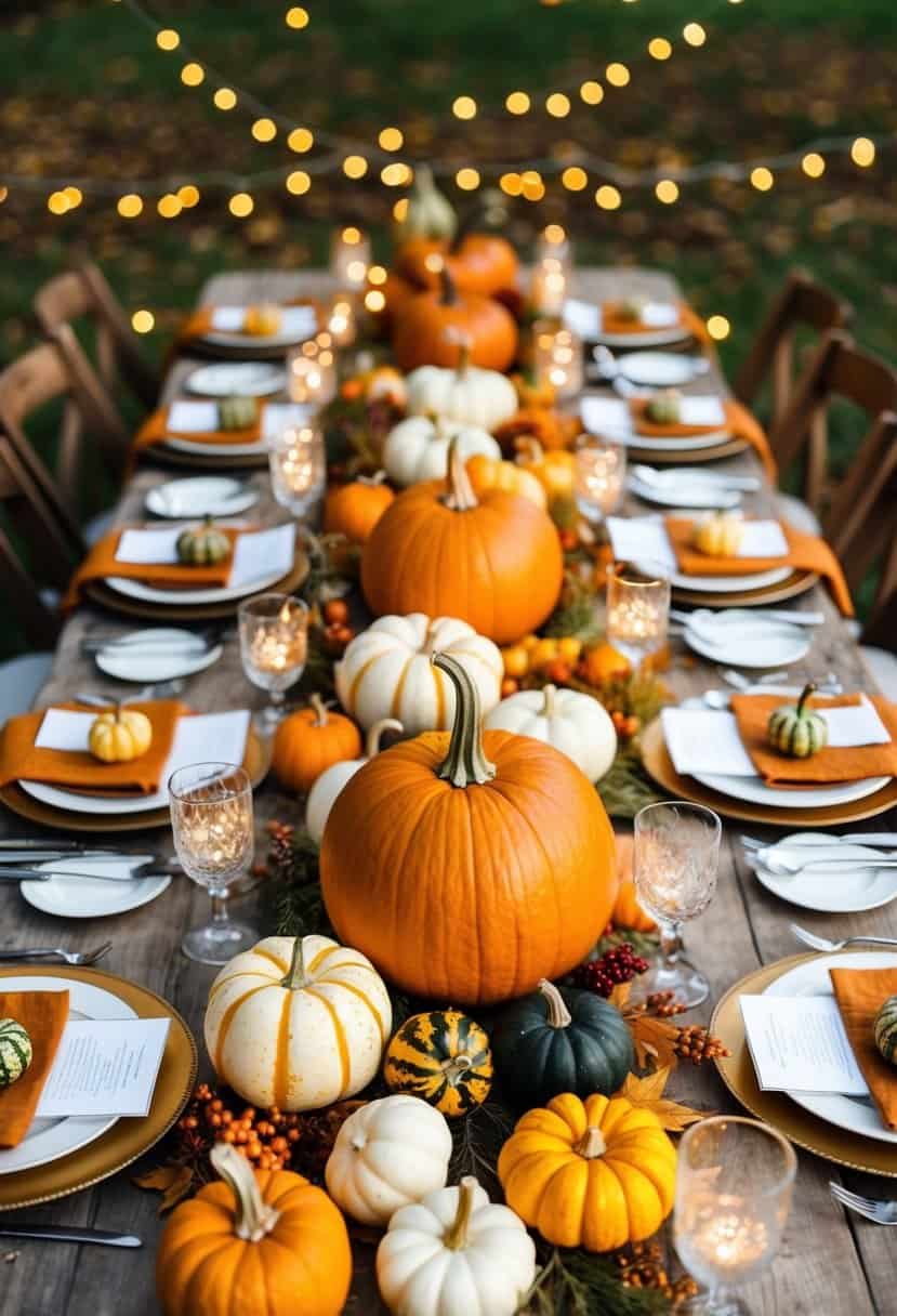 To make it unique, consider mixing pumpkins with seasonal flowers or greenery. This combination will add texture and interest to the table.