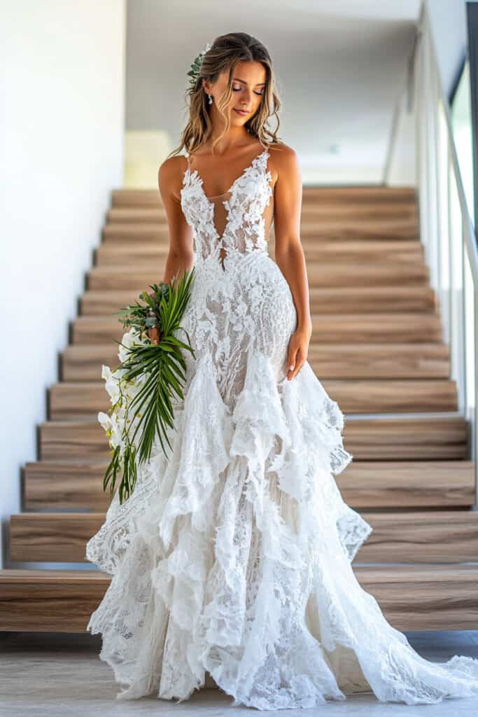 Ruffles add a bit of romance and texture to the look. You’ll find ruffle wedding dresses that fit everything from a backyard bash to a fancy ballroom. And honestly, they’re just fun for dancing.