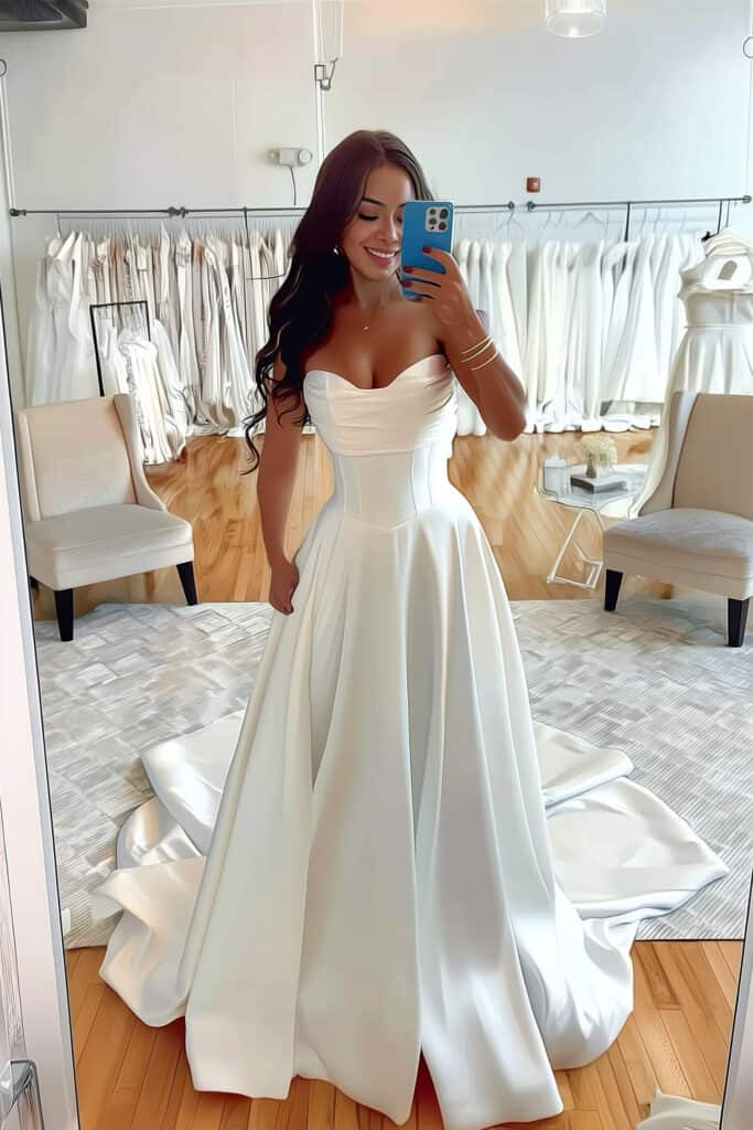 An A-line wedding dress features a fitted bodice and a skirt that flares out from the waist. The shape looks like the letter “A,” which is exactly where the name comes from.